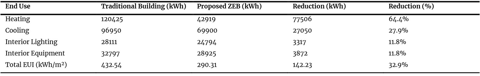 The proposed ZEB model demonstrates a substantial reduction in total energy demand. The annual EUI decreased by approximately 33 , from 432.54 kWh/m for the traditional model to 290.31 kWh/m for the proposed prototype (Fig. 9). This overall saving is driven by significant reductions in specific end-uses. Space heating demand was reduced by 64.4 (from 120425 kWh to 42919 kWh), and space cooling demand decreased by 27.9 (from 96950 kWh to 69900 kWh) (Table 3). These savings are directly attributable to the implementation of Pillar B principles: the high-performance envelope with enhanced insulation and airtightness minimizes thermal transmission, while the strategic rebalancing of the WWR optimizes solar gain and reduces unwanted heat gain. The 64.4 reduction in space heating demand is a direct validation of Pillar B's (Building Envelope) emphasis on super-insulation and airtightness for Ghazni's cold winters.