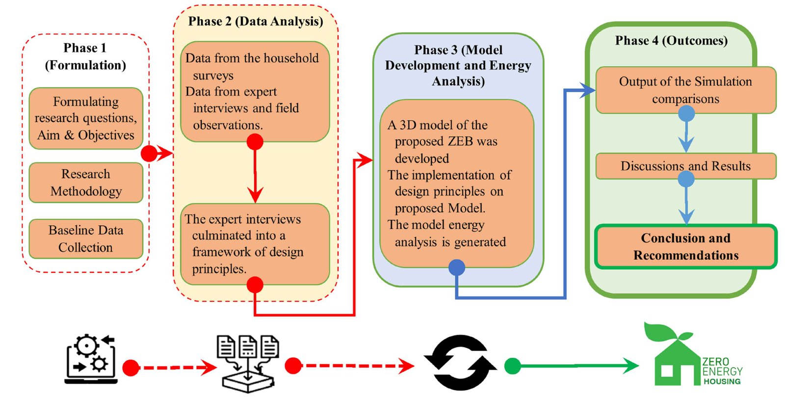This study employs a novel, integrated methodology that synergizes parametric Building Information Modeling (BIM) with localized qualitative data to develop a context-sensitive energy retrofit model for residential buildings in Ghazni, AFG. While mixed-methods approaches are common, the novelty of this research lies in the sequential and iterative integration of these data streams. Specifically, qualitative data from field surveys and expert interviews are used to define the baseline building parameters and socio-technical constraints, which then directly inform the creation of a realistic digital prototype in Autodesk Revit. This model undergoes a rigorous parametric simulation analysis, evaluating EUI, carbon footprint, and PV solar generation potential. Crucially, the optimization of key variables, such as window-to-wall ratio (WWR), building element properties, and solar control strategies, is not based on generic standards but is constrained and guided by the locally gathered socio-economic and cultural data. This ensures that the resulting retrofit model is not only technically optimal but also practically viable and culturally appropriate for the specific context of Ghazni. The research was conducted in four sequential phases, as detailed below and illustrated in Fig. 2.