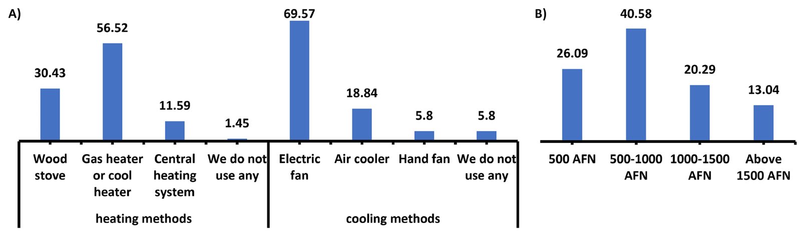 Energy consumption patterns and cost burdens further underscore the problem. For heating, 56.52 of households rely on gas or coal stoves, and 30.43 use wood stoves, highlighting a dependence on traditional, inefficient, and polluting fuels [Fig. 6(a)]. For cooling, 69.57 use electric fans, a less energy-intensive but passive solution (Fig. 6A). Critically, these practices contribute to significant financial strain. Furthermore, 40.58 of households reported monthly electricity bills between 7 to 14 USD [approx. 500-1000 Afghani (AFN)] [Fig. 6(b)]. This widespread financial burden is a powerful motivator for change.