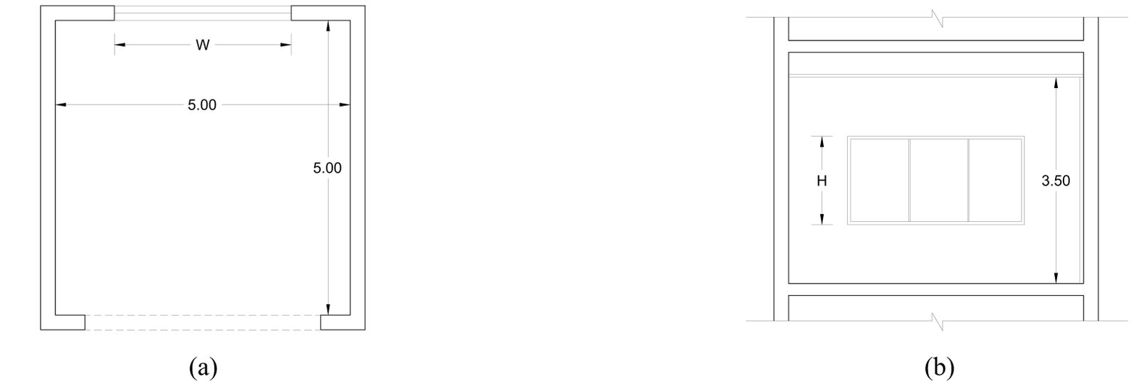 Figure 1 illustrates the schematic plan and section of the suggested office room. As shown in (Fig. 1(a) and (b)), it is a room with defined dimensions: 5 m length, 5 m width, and 3.5 m clear height. The only parameters that were left undefined are the window dimensions represented by the variables W (width) and H (height), as well as the number of window openings, as they were subject to variable parametric iterations during the following experiment procedures.