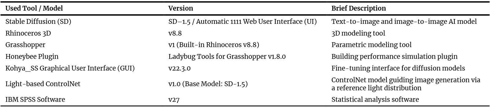 Table 1. Summary of used tools and AI models, including their versions and brief descriptions.