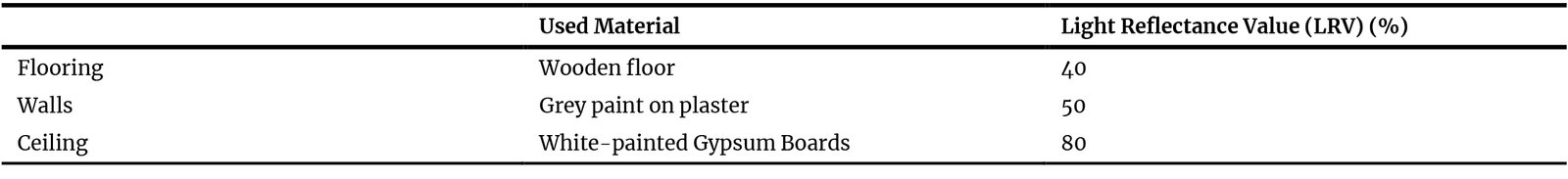 Table 2. Proposed finishing materials for the office room and the corresponding LRV assigned in the Honeybee model.
