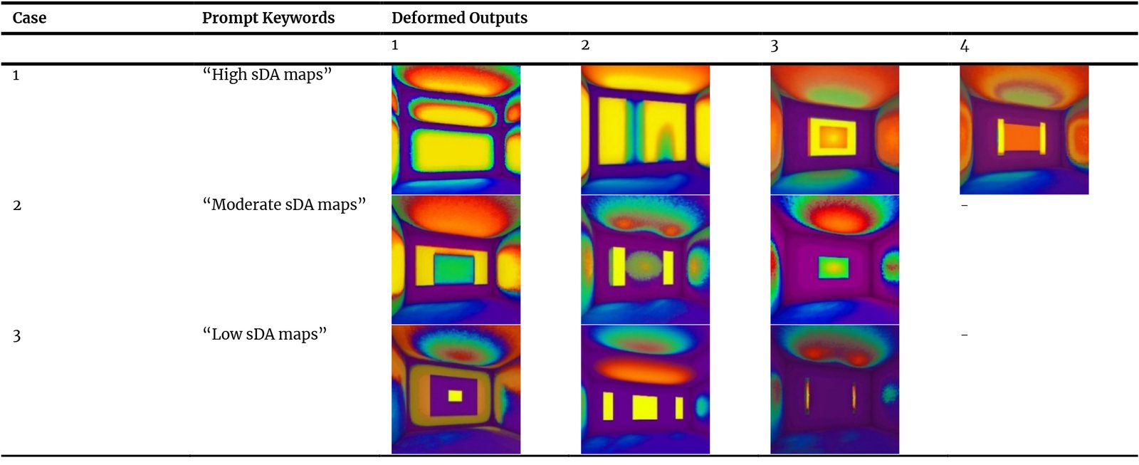 Visual analysis of the AI-generated DA heatmaps enabled the identification of deformed results, including irregular outputs or unrealistic light distribution patterns. Once detected, these heatmaps were excluded from the proposed GenAI-driven design workflow.