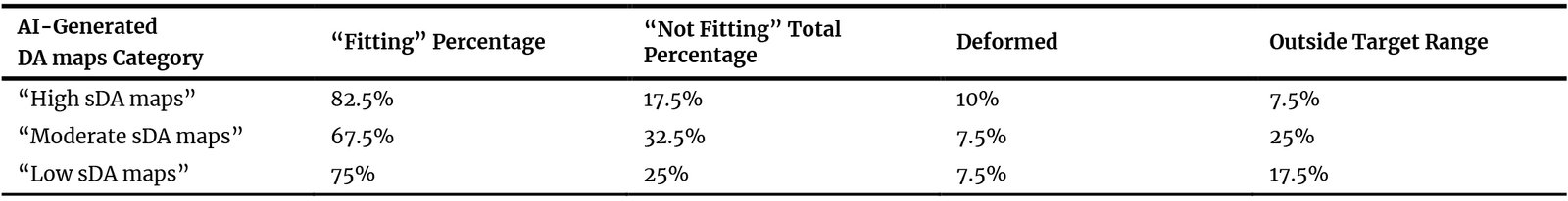 Table 7 provides a detailed categorization of the 40 iterations generated for each prompt keyword, classifying them as “Fitting” and “Not Fitting.” “Not Fitting” category is divided into “Deformed” or “Outside Target Range” outputs. Exact percentage of each category is also provided.