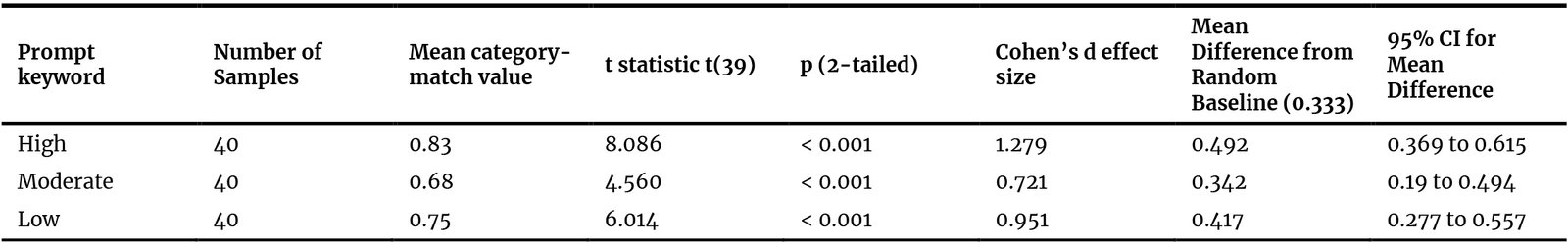 Table 9. Comparison of the statistical results for each prompt keyword with the random baseline percentage (33.3%).