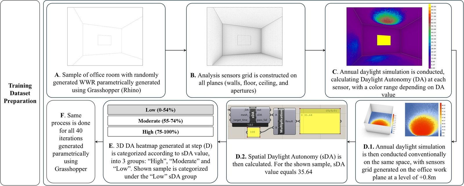 Based on the adopted sDA categorization, the 40-image dataset was divided into 17, 14, and 9 DA heatmaps, belonging to the “High,” “Low,” and “Moderate” sDA groups, respectively. Figure 3 shows the detailed training dataset preparation workflow applied to one sample of the random WWR iterations that were parametrically generated. After applying the analysis sensors grid on the room planes and conducting the annual daylight simulation, the resulting DA values were represented on a three-dimensional heatmap. As the sDA value of this sample was 35.64%, this sample was classified within the “Low” sDA group according to previously defined categorization groups. Same process was then repeated for all 40 randomly generated WWR iterations in order to construct the training dataset, to be ready for the following training processes.