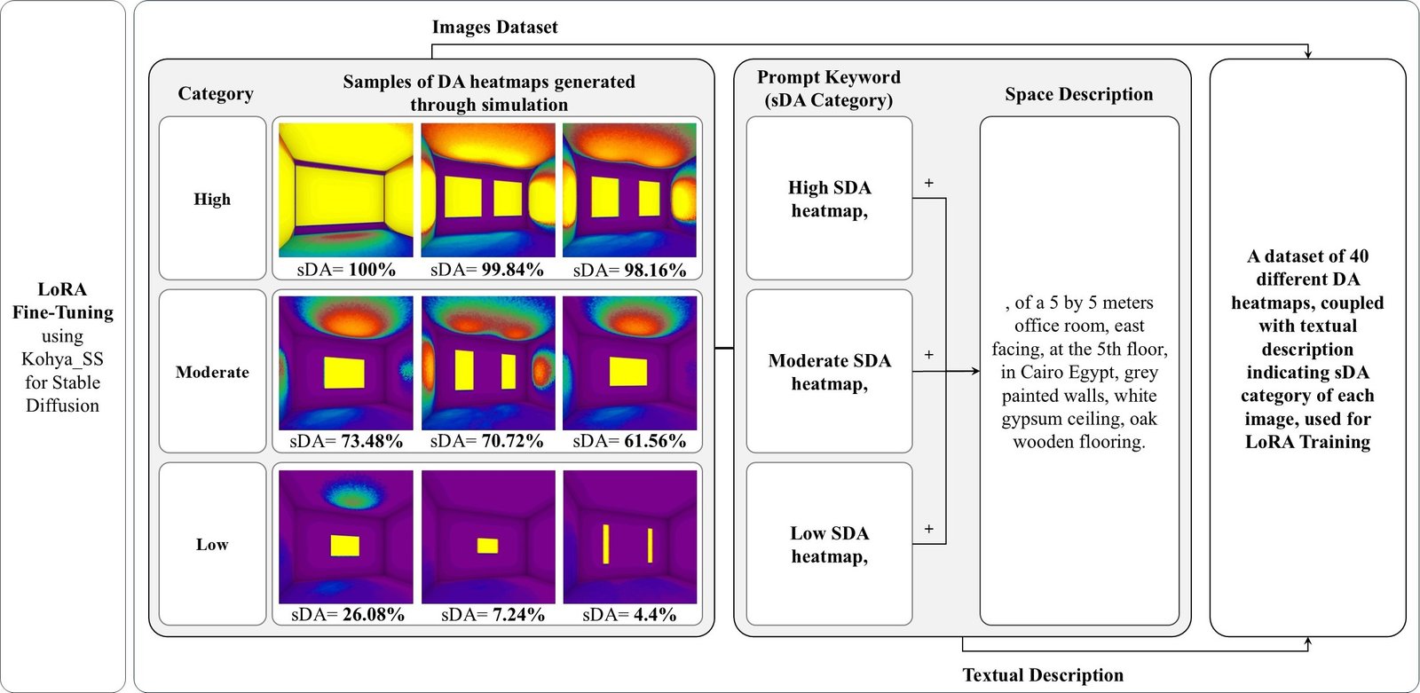 Each DA heatmap was set to be 512 by 512 pixels, then paired with its textual description and labeled according to its sDA group. For example: “High SDA heatmap, of a 5 by 5 meters office room, clear height 3.5 meters, east-facing, at the 5th floor, in Cairo Egypt, grey painted walls, white gypsum ceiling, oak wooden flooring.” The 40 images and textual description were then used as a training dataset for LoRA fine-tuning, based on SD-1.5 model.