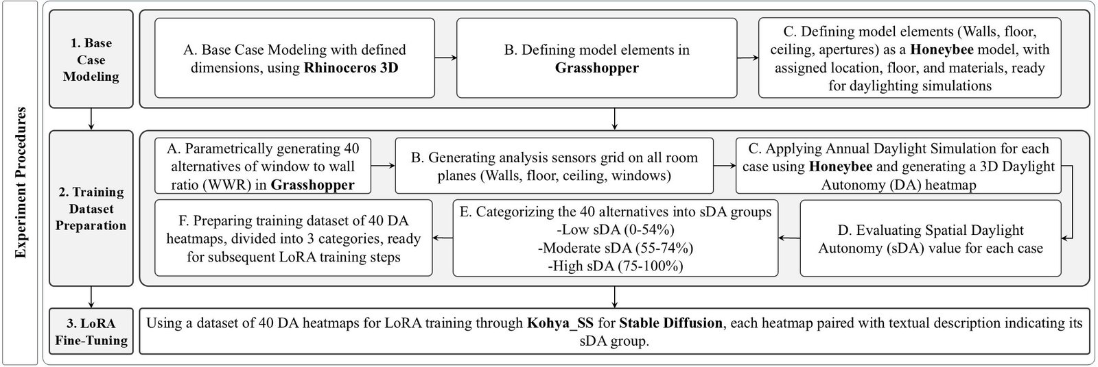 As outlined in the objectives, this study followed a structured experimental methodology to employ and test a proposed GenAI-driven workflow, enabling the achievement of target sDA ranges through AI outputs. The process involved applying a series of detailed procedures using the required tools, followed by validating the experimental results.