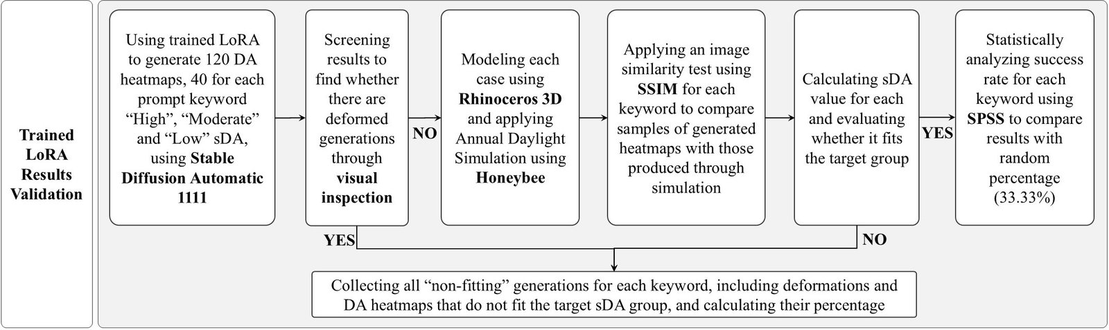 To summarize the experiment procedures, (Fig. 6 shows the detailed steps starting with the base case modeling, then the preparation of the DA heatmaps training dataset, which was finally used for LoRA fine-tuning. Then results validation took place to validate the effect of the trained LoRA on adjusting sDA values of generated designs.