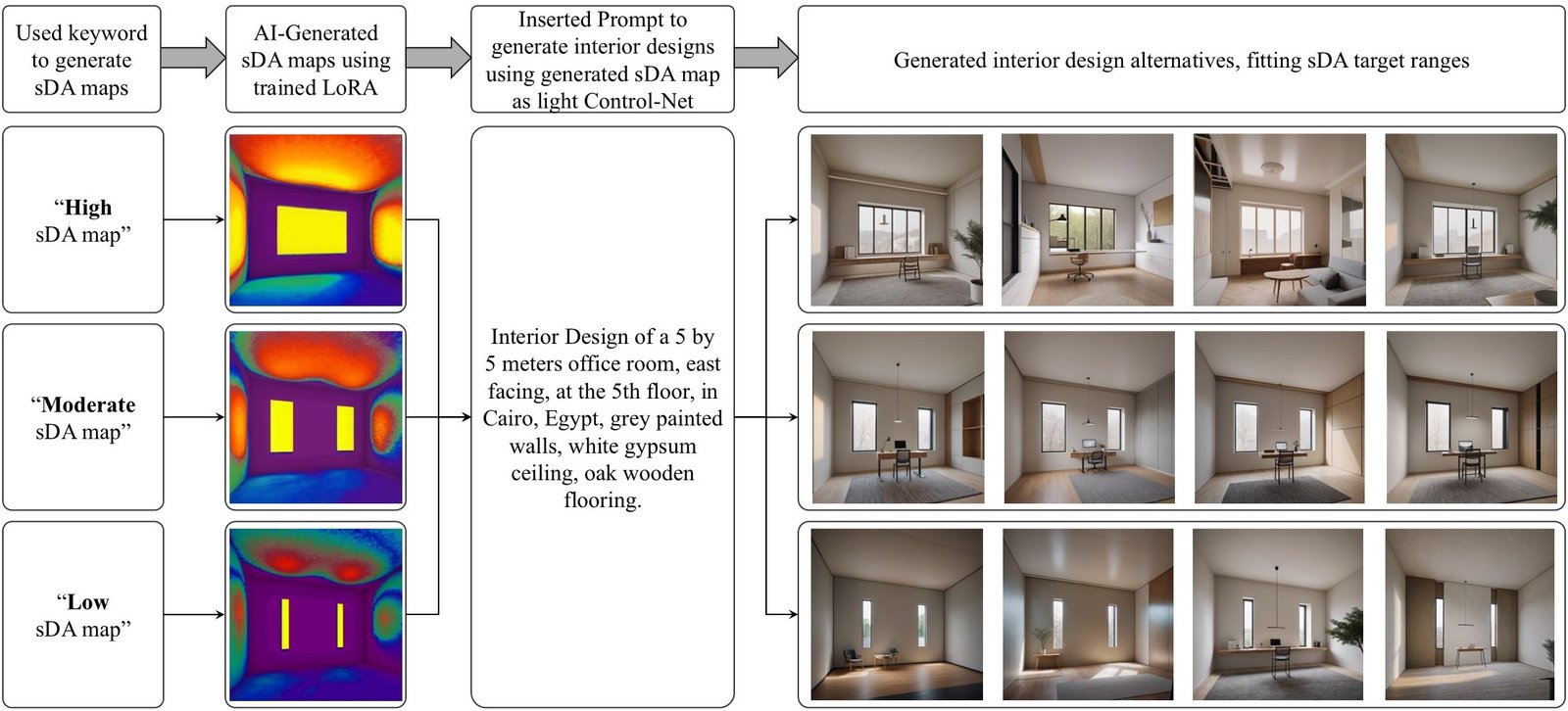 For instance, proposed workflow was applied to the previously defined office space to generate four interior design alternatives per sDA category. First, trained LoRA was applied in SD Automatic 1111 Web UI to create 3 DA heatmaps, one for each prompt keyword. Each map was then used as an input to the light-based ControlNet, functioning as a guiding condition. Then a detailed description for the intended room design was inserted as text prompt. For the 3 cases, the same prompt was used: “Interior Design of a 5 by 5 meters office room, east-facing, at the 5th floor, in Cairo, Egypt, grey painted walls, white gypsum ceiling, oak wooden flooring.” Finally, four design iterations were generated at each case, all fitting target sDA values range.
