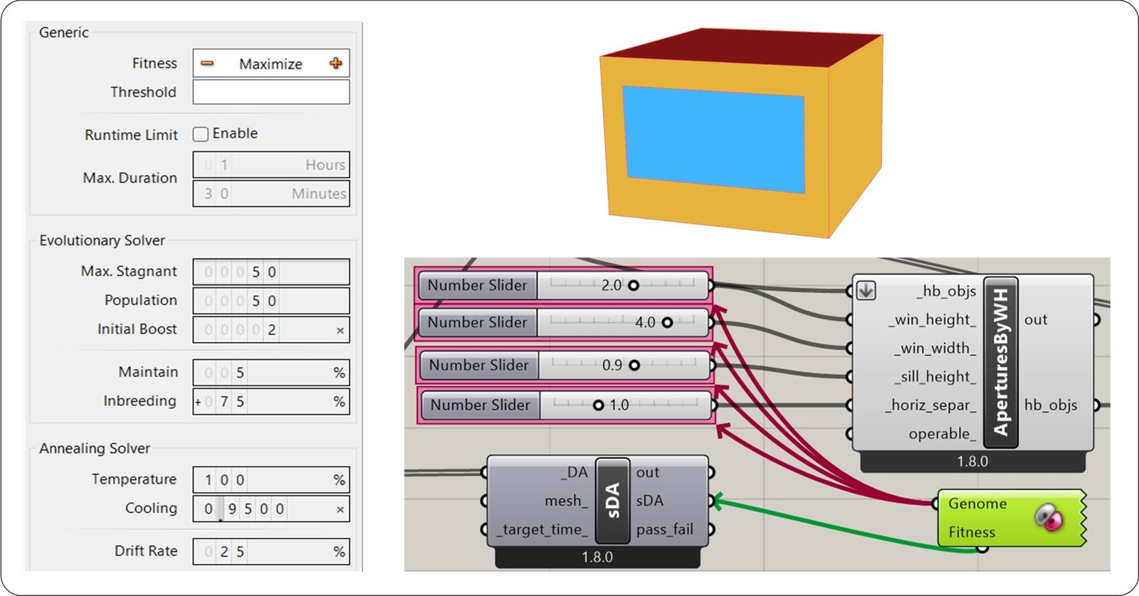 Fig. 9. Galapagos optimization setup in Grasshopper, showing the selected genome parameters, fitness definition, optimization settings, and the base case Honeybee model.