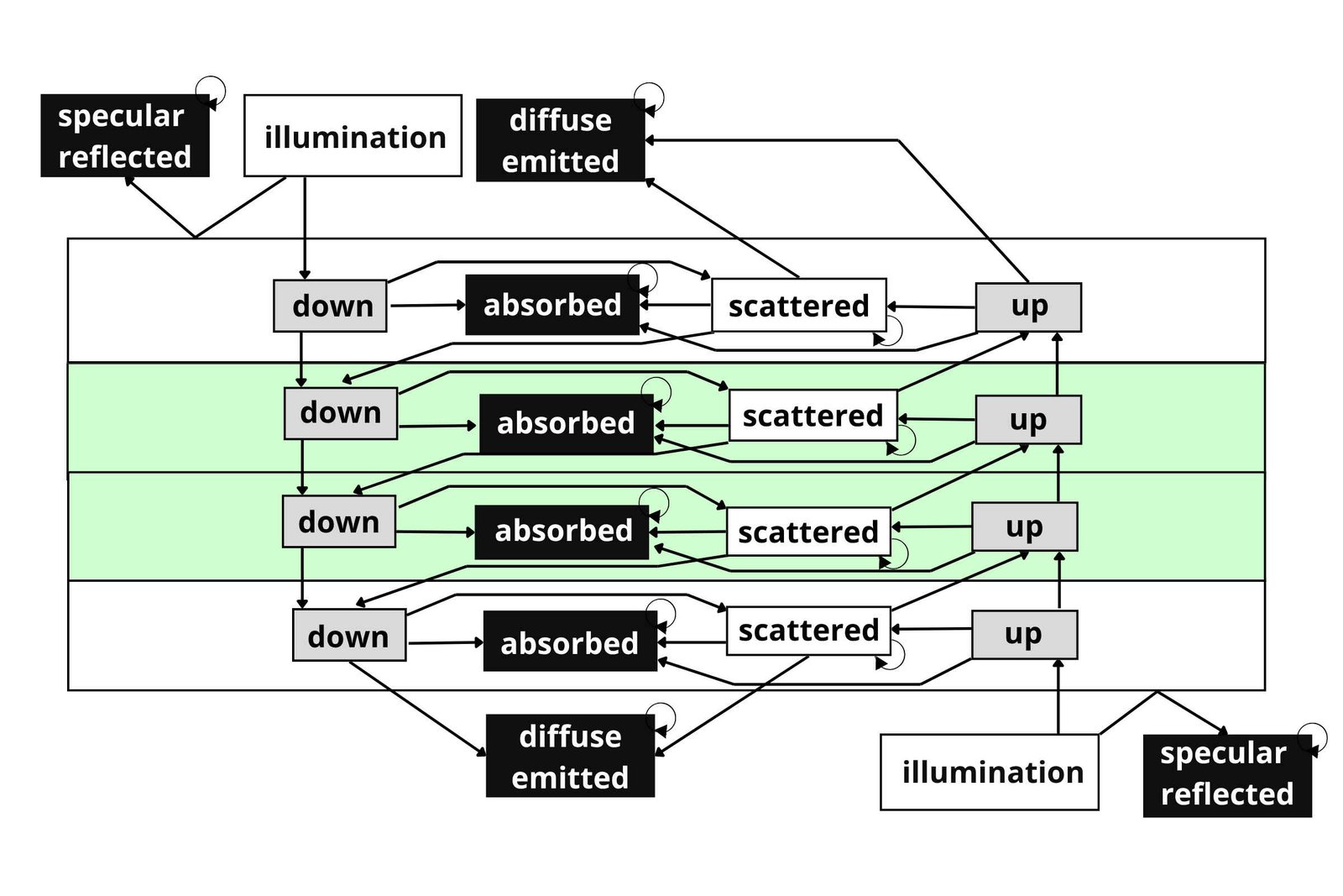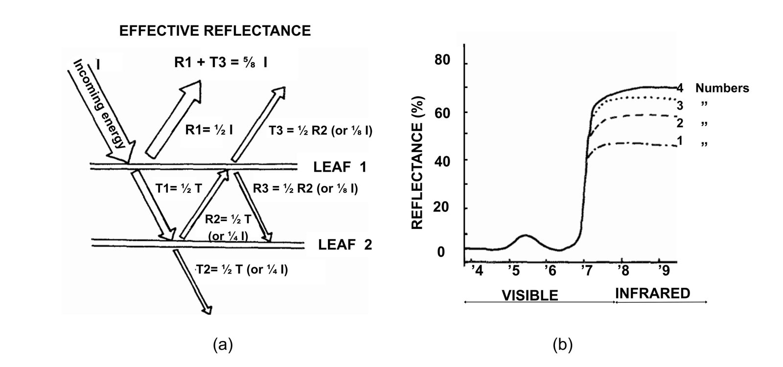 Fig. 10. (a) Reflectance and transmittance from multiple leaf layers. (b) The consistent percentage of reflectance in visible light [50].