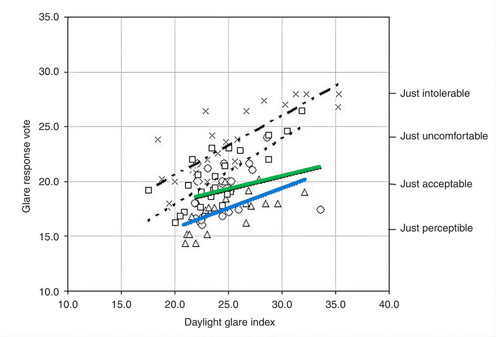 The results show the advantage of vegetation as a shading device compared to the artificial ones that usually produce glare by light reflection from the material, especially if it’s from metal material with light color. It also answered the question asked by Lynes to Tuaycharoen about glare from diffusing screen (diffuse reflectance mechanism), which also happened in leaf layers but was not perceived as glare [10].