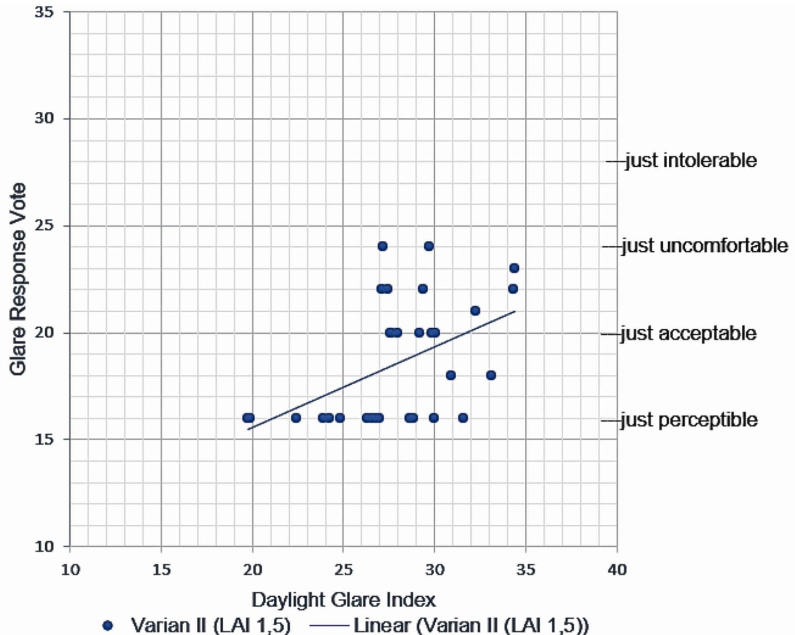 The experimental results showed that a vegetative geometry with medium density (LAI 1,5) not only reduced DGI to a moderate level but also yielded significant values for DF, GSV and IV. LAI 1,5 variant consistently produced lower DGI values compared to LAI 0,75, suggesting that medium foliage density was more effective in mitigating glare to the level of ‘just perceptible’. This was further supported by the reduction in GSV from 2,4 (just acceptable) to 1,8 (perceptible). Although DF values for LAI 1,5 ranged between 6,2% and 7,3%, which exceeded standard thresholds, they remained in the ideal range and were suitable for visual tasks requiring higher performance levels, such as detailed drawing, typically recommended at 5–8%. This showed that medium foliage density did not compromise the adequacy of natural lighting.