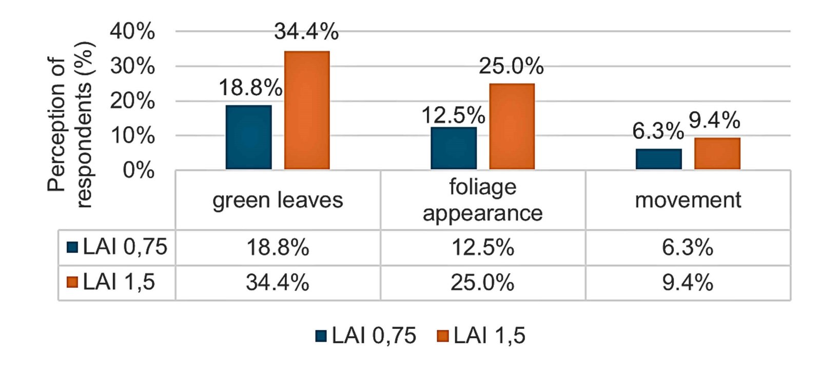 Elements perceived by respondents as beautiful or very beautiful include the following (1) the green color that provided shade, coolness, and a sense of relaxation, (2) the hanging foliage creating a natural impression and depth of view, (3) the ability to observe outside without glare, and (4) the presence of movement preventing monotony. Elements considered neutral further are sufficient visual variation, lack of structure and uneven distribution, insufficient density, partially obstructed view, as well as unattractive form. In contrast, the elements considered not beautiful are uneven plant distribution, insufficient density and greenness. From these results, there is an increase in aesthetic response corresponding to the rise in foliage density from LAI 0,75 to LAI 1,5, attributed to the green leaves colour, the appearance of hanging foliage and its movement (Figure 13).