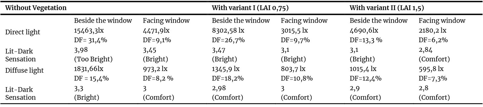 As shown in Table 2, a reduction in illuminance of up to 50% was observed at beside the-window position under direct sunlight conditions leading to an improvement from the Too Bright condition—recorded in Without vegetation scenario (DF = 31,4%) and Variant I with LAI 0,75 (DF = 26,7%)—to a Bright condition in Variant II with LAI 1,5 (DF = 13,3%). Similarly, a 30% reduction in illuminance was recorded at the window-facing position, shifting lighting condition from Bright in Without vegetation (DF = 9,1%) and Variant I with LAI 0,75 (DF = 9,7%) to Comfort in Variant II with LAI 1,5 (DF = 6,2%). Although there was an increase in DF in Variant I with LAI 0,75 recorded at 18,2% (side-window position) and 10,8% (window-facing position)—compared to Without vegetation condition (DF = 15,4% and 8,2%, respectively) under diffuse light conditions, respondents still perceived lighting as Comfort.