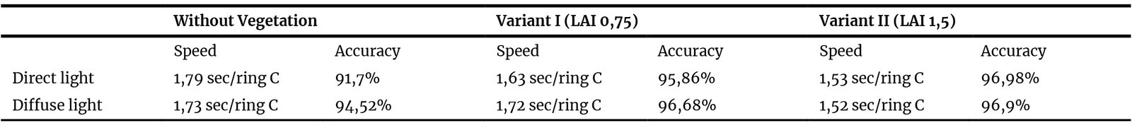 The elevated DF levels in Variant I also lead to a slight delay in visual task performance at the window-facing position. Under direct light conditions without vegetation, the response time was 1,7 seconds per ring C, which increased to 1,72 seconds in Variant I. Under diffuse light, the response time increased from 1,62 seconds (without vegetation) to 1,69 seconds in Variant I. However, accuracy improved in Variant I and was further enhanced in Variant II. The study affirms that increased foliage density enhances visual accuracy and performance.