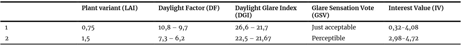 In conclusion, Table 8 presented a summary of the experimental results for the vegetated façade variants (LAI 0,75 and LAI 1,5) in relation to four key visual comfort parameters namely DF, DGI, GSV, and IV.