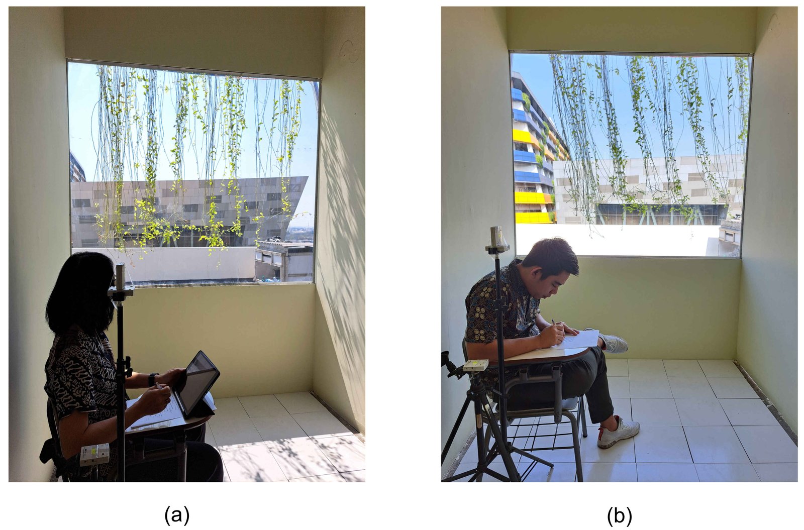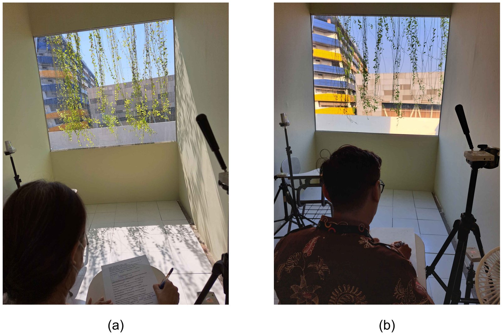 As the design of plant-based façades by architects worldwide on opaque surfaces [28,30] continues to evolve and covering glazed façade openings, this study presents a novel and critical research gap in the potential of biotic façades as glare mitigation strategies. Specifically, how vegetation on façades reduces glare while maintaining adequate daylight levels and providing natural views for office workers in high-rise buildings. A preliminary study regarding common kinds of artificial shading devices in geometry and mechanisms compared to plants has been done, showing that the leaf area as plant-geometry can be arranged to find a well-balanced solution for light environment [27,31]. This study aimed to find how different leaf area index of plants reduced high luminance on glass façade, illuminance at the working plane, and how office users perceived the quantity of light as well as the beauty of the view seen as a qualitative aspect. It is a continuation of previous analysis regarding the correlation between Leaf Area Index (LAI) to shading factor and luminance index that uses a model box [31], as well as how leaf performs in a real room with office users as respondents.
