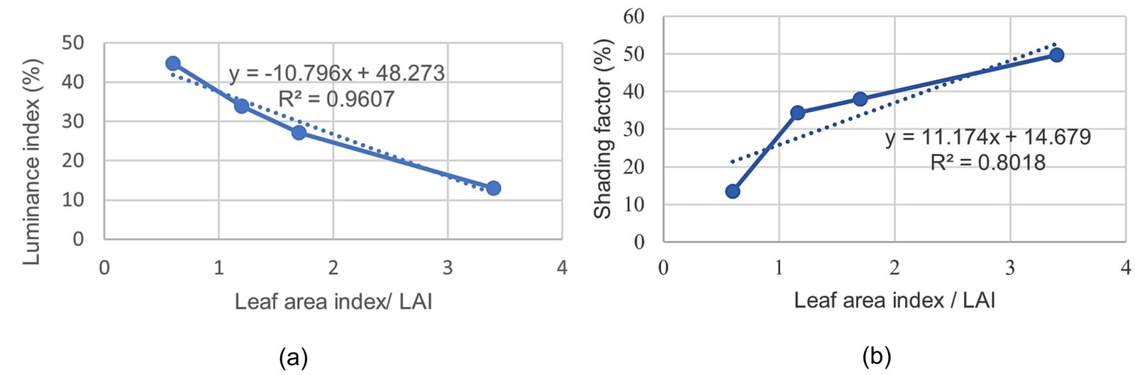 Fig. 8. (a) Luminance index and (b) Shading factor of Vernonia elliptica with different LAI [31].