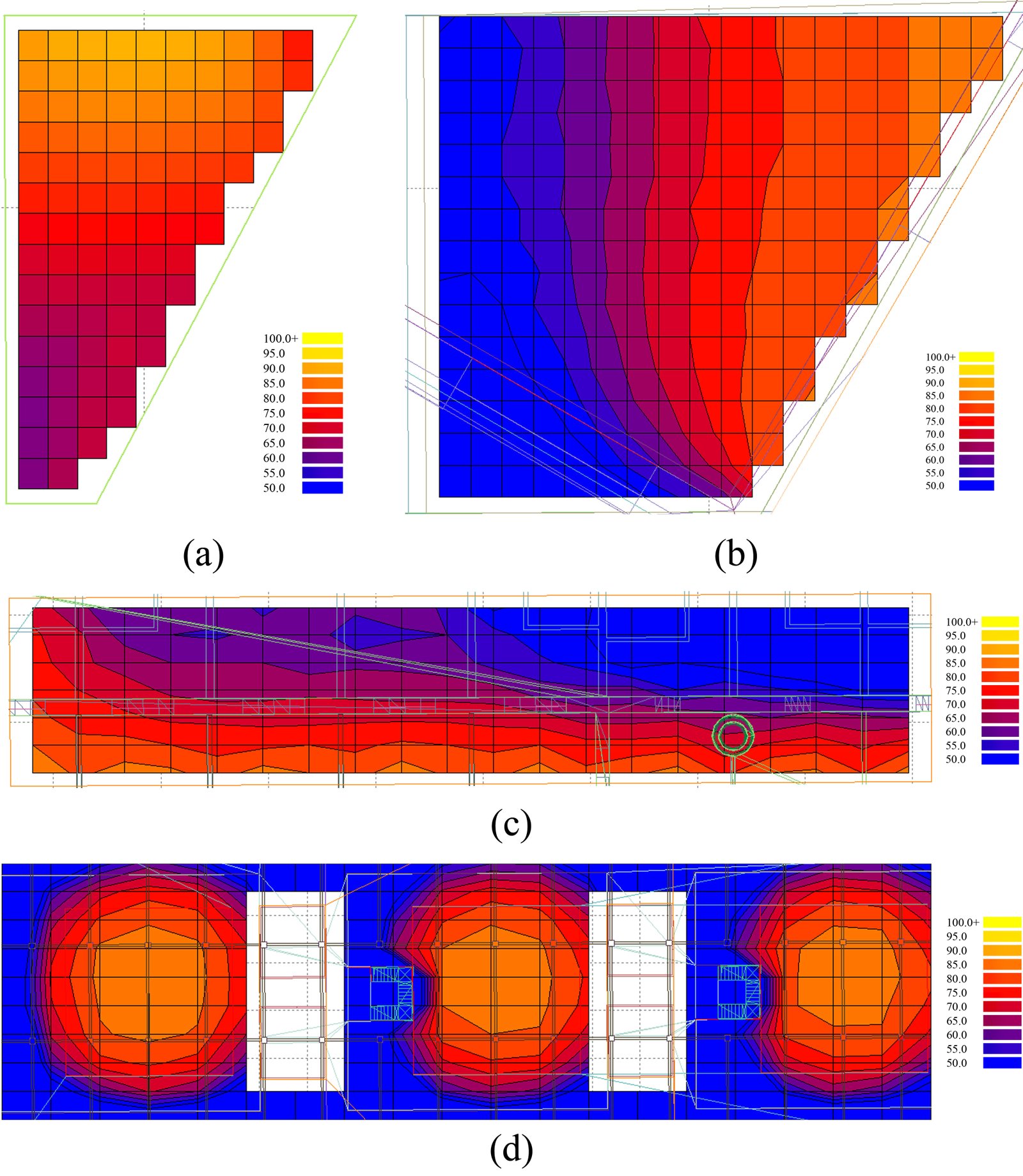 Fig. 9. Spatial distribution of sDA300/50% for some analyzed rooms: (a) north-facing residential room (without blinds), (b) south-residential room (with blinds), (c) study room (without blinds), (d) common spaces (with blinds).