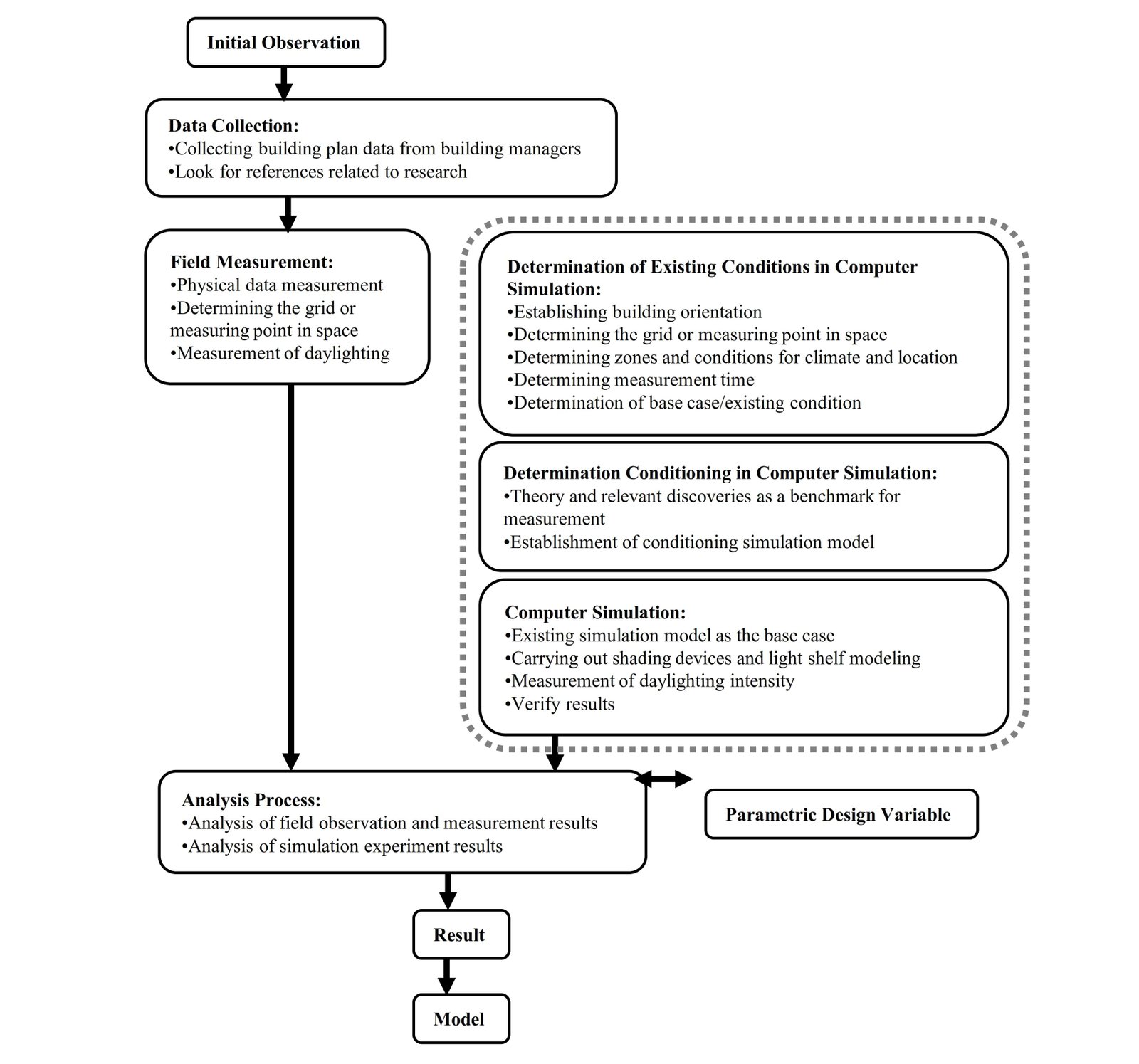 The research process consists of field measurements and computer simulations. Data were analyzed using Microsoft Excel software to look for graphs of increases or decreases in illumination values from measurements for each room in the lecture building. The data obtained is primary and secondary. Primary data consists of the results of existing measurements in the form of: lighting measurements (illumination values and size of imaging angles) and spatial geometry measurements; computer simulation results that are similar to existing conditions (illumination values and isometric 3D rendering images); and computer simulation results for improvised design (illumination values and isometric 3D rendering images). Meanwhile, the secondary data is in the form of theoretical studies. Research flow diagram is shown in Fig. 1.
