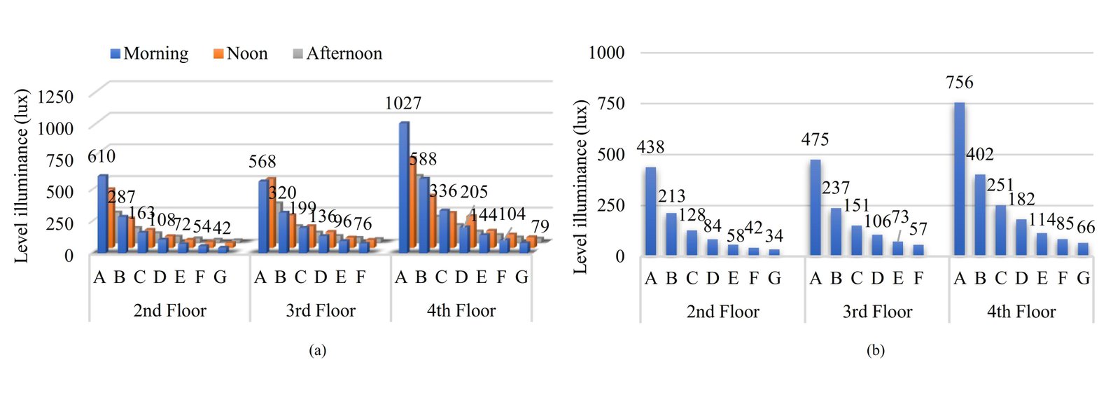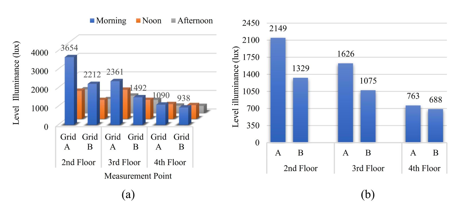 It can be seen in Fig. 7 that the illuminance value on grid A is higher than grid B for floors 2, 3, and 4. On the 2nd floor, there was a decrease of 0.4% from 2,149 lux in grid A to 1,329 lux in grid B. Similarly on the 3rd floor there was a decrease of 0.3%, and on the 4th floor a decrease of 0.1%. This indicates that the area near the opening has a higher illuminance value than the area far from the opening. Judging from the acquisition of the intensity of the three floors of the same size, it can be concluded that the intensity of the 2nd floor is the highest, then the 3rd floor, and the lowest 4th floor. The higher the floor level, the lower the lighting intensity.