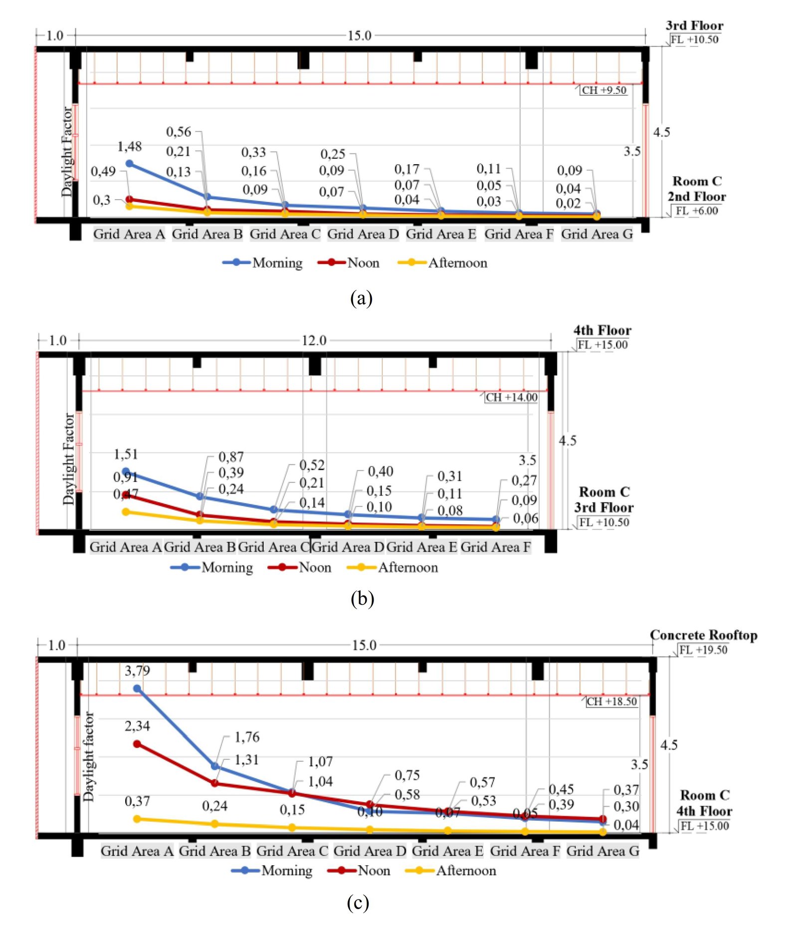 Fig. 8. Daylight factor profile of East orientation: (a) 2nd floor (left); (b) 3rd floor (center); and (c) 4th floor (right).