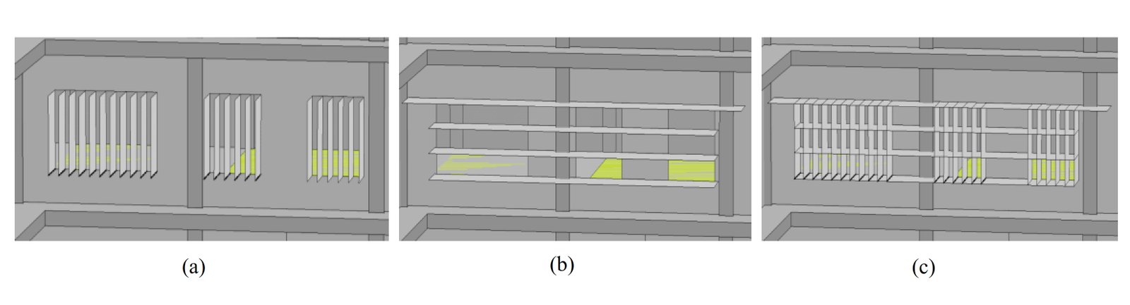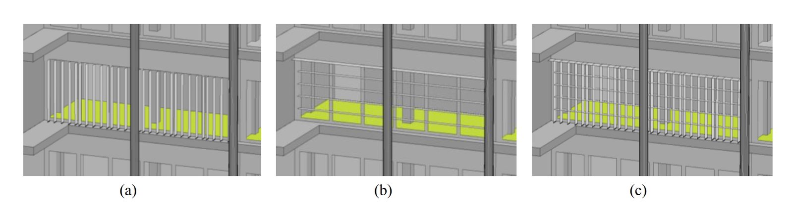 Fig. 17. The 3D image shows the shading device orientation West model: (a) vertical fin; (b) horizontal louvers; and (c) egg-crate.