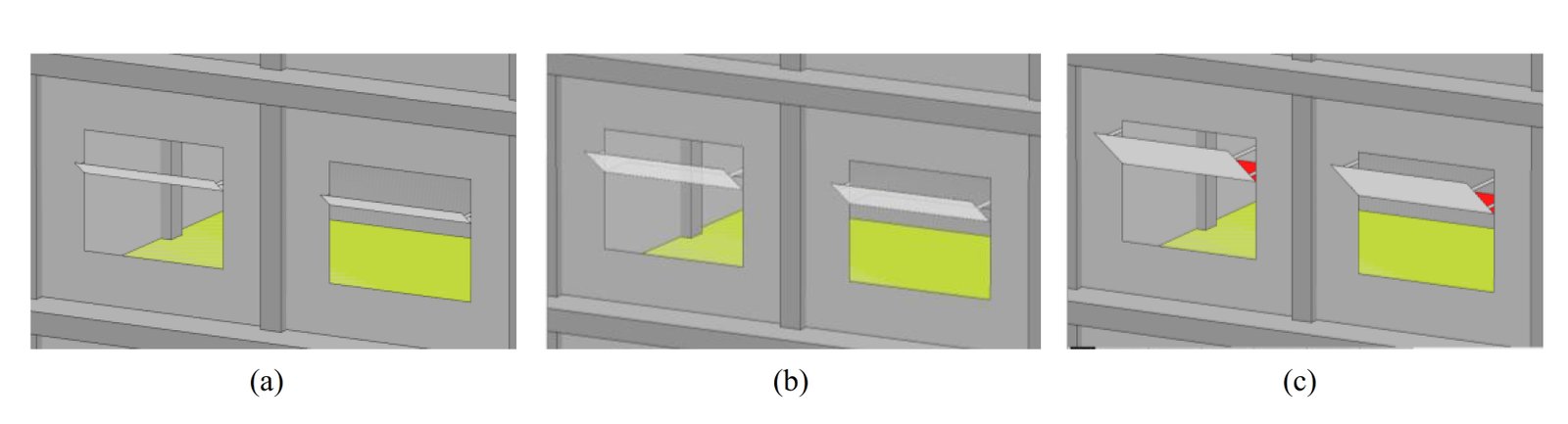 Fig. 22. 3D view of the South orientation light shelf model: (a) interior-exterior light shelf 50 cm; (b) interior-exterior light shelf 100 cm; and (c) interior-exterior light shelf 150 cm.