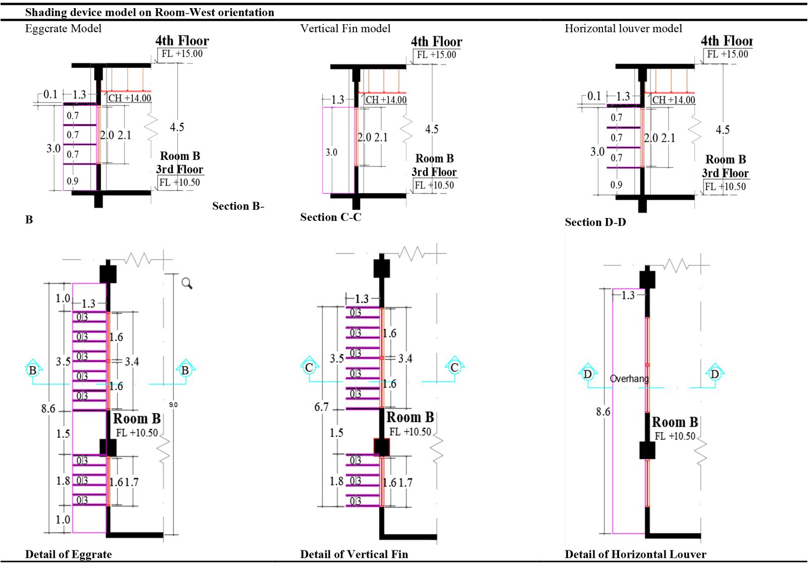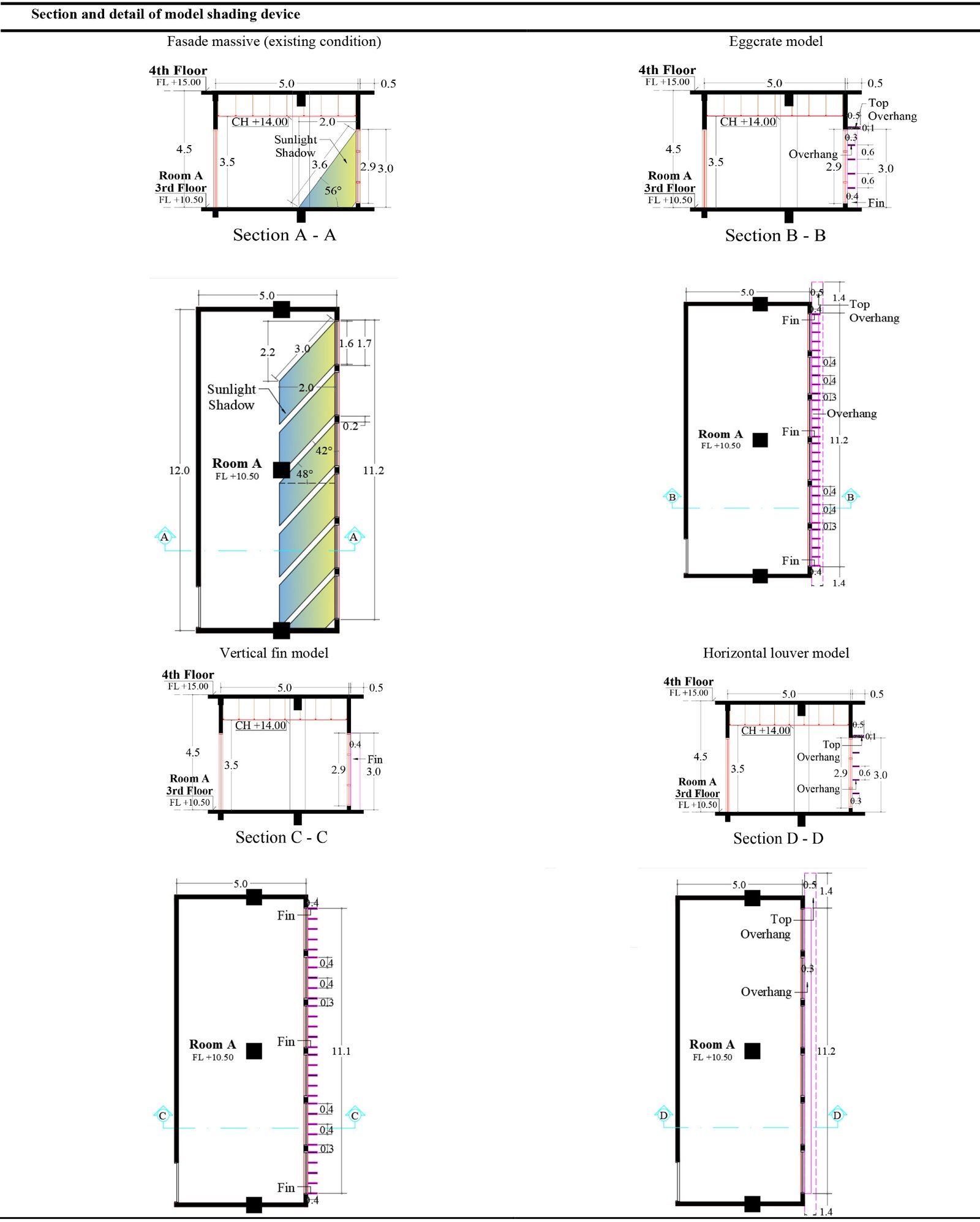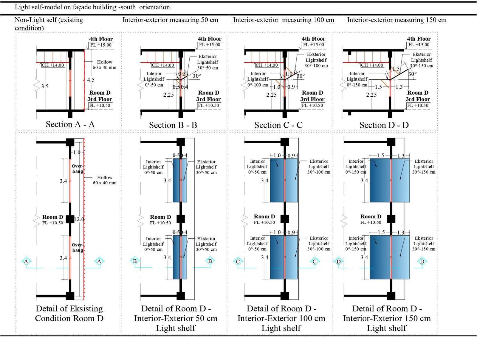 Table 3. Details of shading device cut east side classroom – 3rd floor (a) existing condition, (b) egg-crate, (c) vertical fin, and (d) horizontal louver shading device.