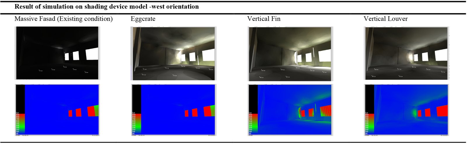 Table 5 shows a space section in the west orientation using an egg crate, vertical fin, and horizontal louver model design. In this research, a simulation was carried out in a room oriented towards the west. Next, a Radiance illumination simulation is carried out to determine the value of natural lighting illumination in the space using 3 shading device models, as in Table 3 below.