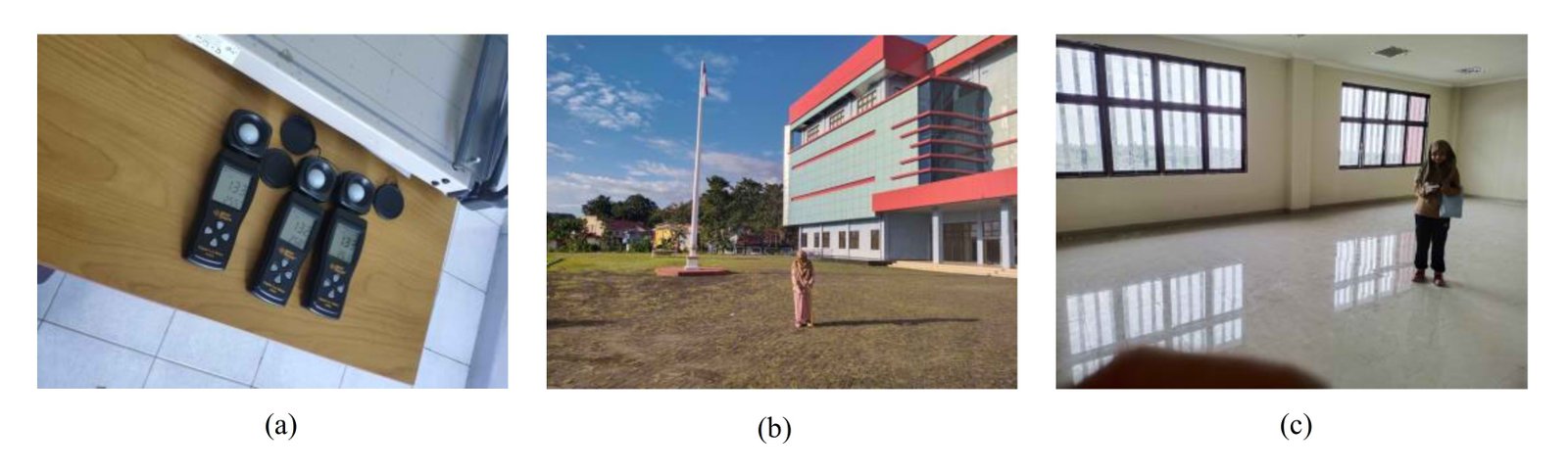 Fig. 3. (a) Digital lux meter calibration process; (b) measurement process in the field; and (c) indoor measurement process.