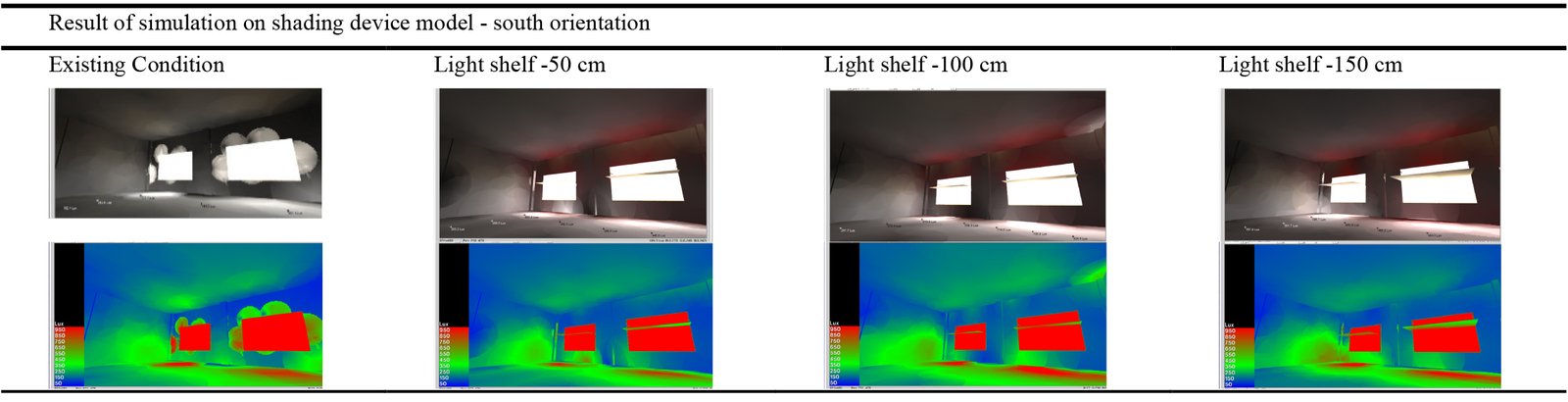 Table 10 shows the isometric 3D of the south orientation displaying daylight rendering results of Radiance Illuminance. It can be seen that when the room in the setting resembles the existing conditions, the level of illuminance is high in the window area. After the mesh is removed and the room is installed light shelf, the increase in illuminance value gets deeper into the space, characterized by the green color that is getting to the center of the room, and the intensity of lighting in the window area decreases.
