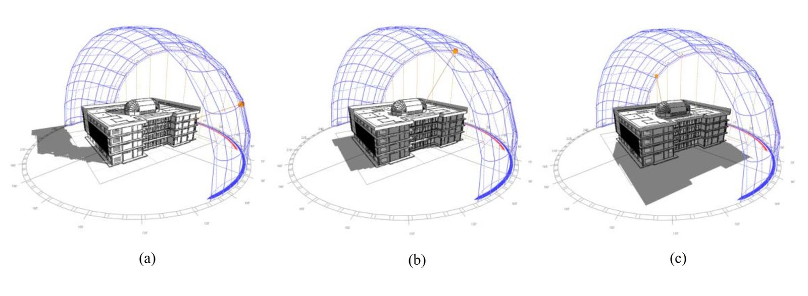 Fig. 5. Shadow of the building: (a) in the morning; (b) during the day, and (c) in the afternoon.