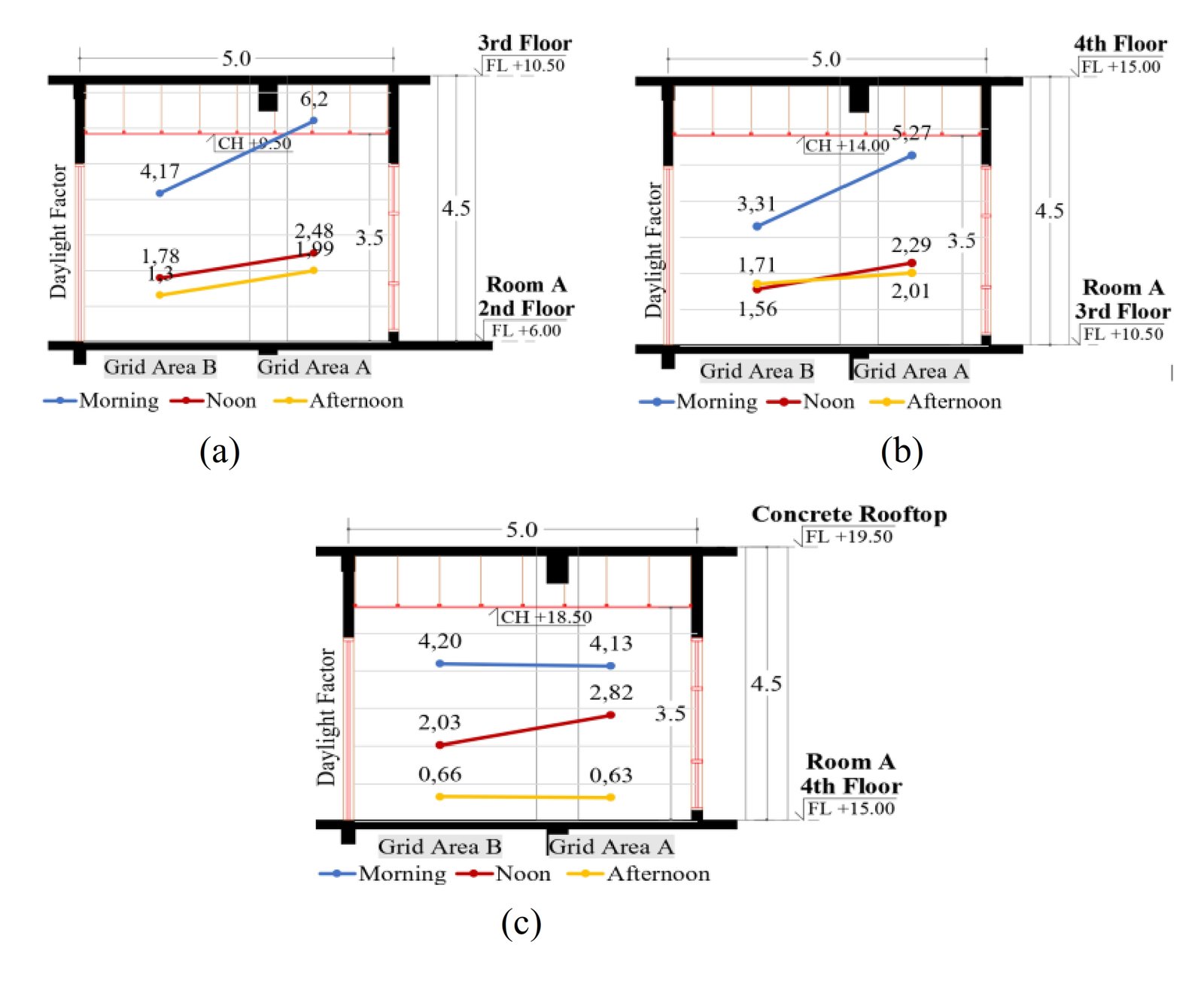 Fig. 14. Daylight factor profile of Southside classrooms: (a) 2nd floor/ left; (b) 3rd floor/ center; and (c) 4th floor/ right.