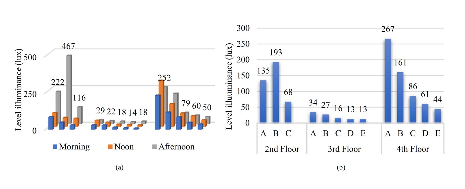 Figure 14 shows that average daylight factor measurement results (cloudy sky) that meet the standard are the 2nd floor (morning measurement time), the 3rd floor in grid A (2.89%), the 4th floor in grid B (2.5%), and C (2%), where the standard daylight factor of office buildings is 2% - 4%. The light distribution of the 2nd floor tends to be evenly distributed while the 3rd and 4th floors are high in intensity near the openings. Furthermore, within 3 days of measurement, several uniformity ratio values meet the standards on the 2nd floor (ranging from 42.5% - 78%) to the 4th floor (ranging from 41.9% - 47.2%), where the uniformity ratio standard is at least 40% of the room area.