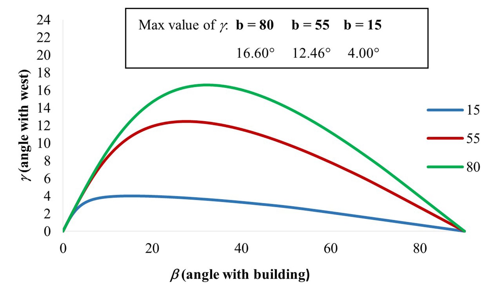 Table 4 shows us different input angles on how to change the angles with the building (β) and the west (γ) for three variations of Altmann linkage-based light shelves. Figure 8 shows the γ verses β for each variation of the Altmann linkage-based light shelf. Three different curves for each of the three different Altmann light shelves are shown. The blue curve is for b=15, the red curve is for b=55, and the green curve is for b=80. Using angles (β) and (γ), the most accurate light shelf can be designed to direct the western sun into the offices with south-facing windows. Eventually, paying attention to the ratio between link lengths is significant. As the link length ratio, a/b decreases, the rotation of the light shelf to the west increases. Figure 8 also shows the maximum angle (γ) to the west.