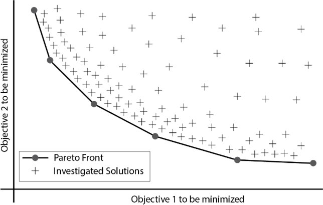 Complex problems with multiple criteria which need to be optimized simultaneously are usually addressed by MOEAs. In general, optimizing an objective in such problems will influence another for the worse, meaning that these objectives are in contradiction to each other. Therefore, one solution will not satisfy all the objectives, and as a result, a set of optimal solutions will be needed, which are known as the Pareto Front [51] (Fig. 1).