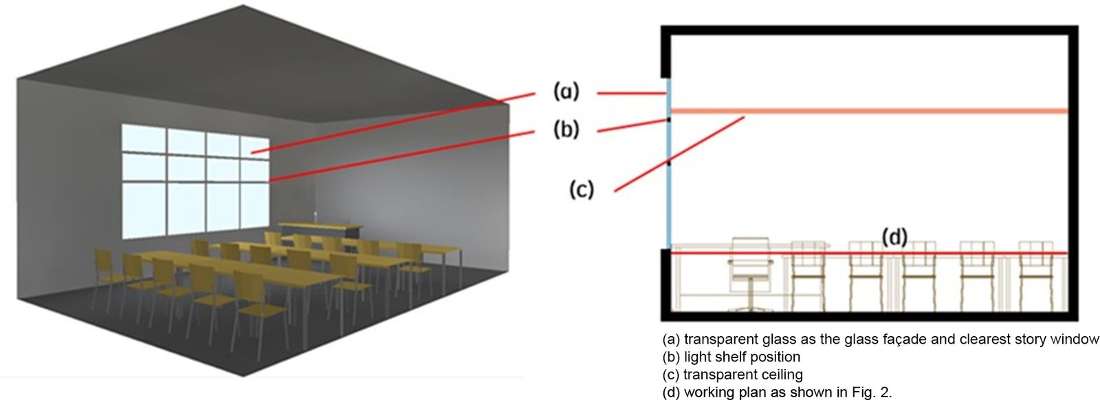 Following the literature review, fifty-five options including the first option as an original classroom without installing a light shelf as the base case and other combinations were created by three independent variables as 1) type of curved light shelf, 2) ceiling characteristics and 3) window characteristics.