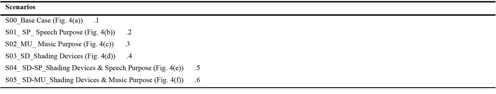 Taking all these factors into account, calculations, and evaluations were conducted for six different scenarios: one base case scenario, two acoustic scenarios, and three daylight scenarios in addition to the acoustic scenarios (Fig. 4). The scenarios developed are as follows: