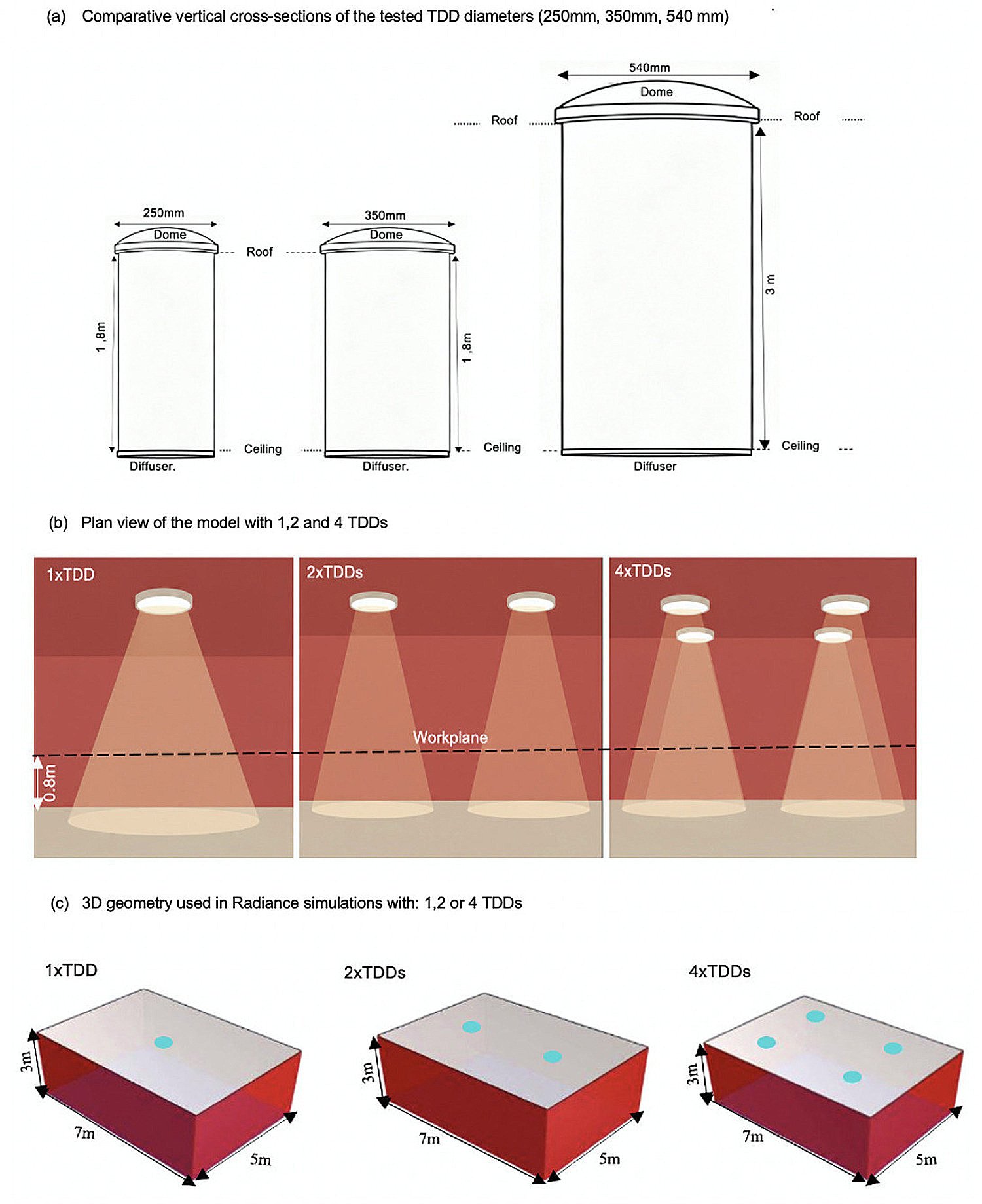 Figure 1, summarizes the numerical model: (a) cross-sections of the three tube diameters; (b) 2-D floor plans showing the 1-, 2-, and 4-TDD layouts and (c) the corresponding 3-D Radiance geometry used for the simulations.