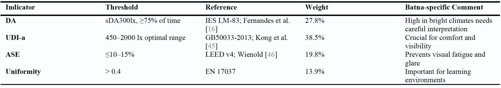 where, w1, w2, w3 and w4 are the weighting coefficients assigned to each criterion. The term (100 − ASE) is used simply to align ASE with the other reward-based indicators. These coefficients were established based on international daylighting standards and certification systems (IES LM-83, LEED v4.1, EN 17037) and were adapted to prioritize visual comfort and reduce glare risks in educational spaces exposed to high solar conditions. This multi-criteria approach aligns with established daylighting research methodologies (Reinhart & Wienold, 2011])and reflects best practices for constructing composite indicators [OECD, 2008].