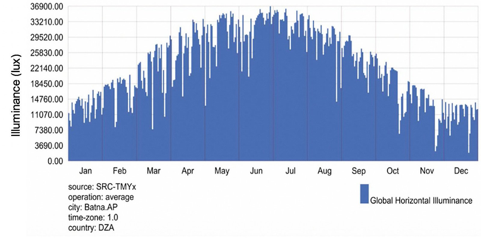 Figure 2, below illustrates the annual variation of global horizontal illuminance in Batna (Algeria), based on SRC-TMYx climate data. A clear seasonality can be observed: illuminance levels are lowest in winter, with daily averages ranging from 3,690 to 11,000 lux between December and February, while maximum values are reached in summer, frequently exceeding 30,000 lux from May to August. This dynamic reveals a particularly high solar potential, highly favorable for exploiting daylighting throughout the year.