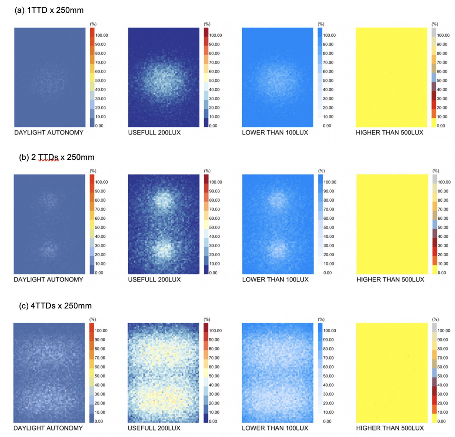 The illuminance maps in Fig. 3, corresponding to the 250 mm TDD configurations, indicate that with a single TDD, the useful daylight area ( 200 lux) remains very limited, while the map for 100 lux shows that more than 70% of the room is underlit. The absence of red zones on the 500 lux map indicates a negligible risk of over-illumination. Adding a second TDD improves daylight coverage, but the distribution remains uneven, with underlit areas persisting at the room's periphery. With four TDDs, the useful area ( 200 lux) covers nearly the entire room, and underlit zones become marginal. The risk of over-illumination ( 500 lux) remains very low, highlighting the benefit of multiple light sources for improving uniformity without causing glare.