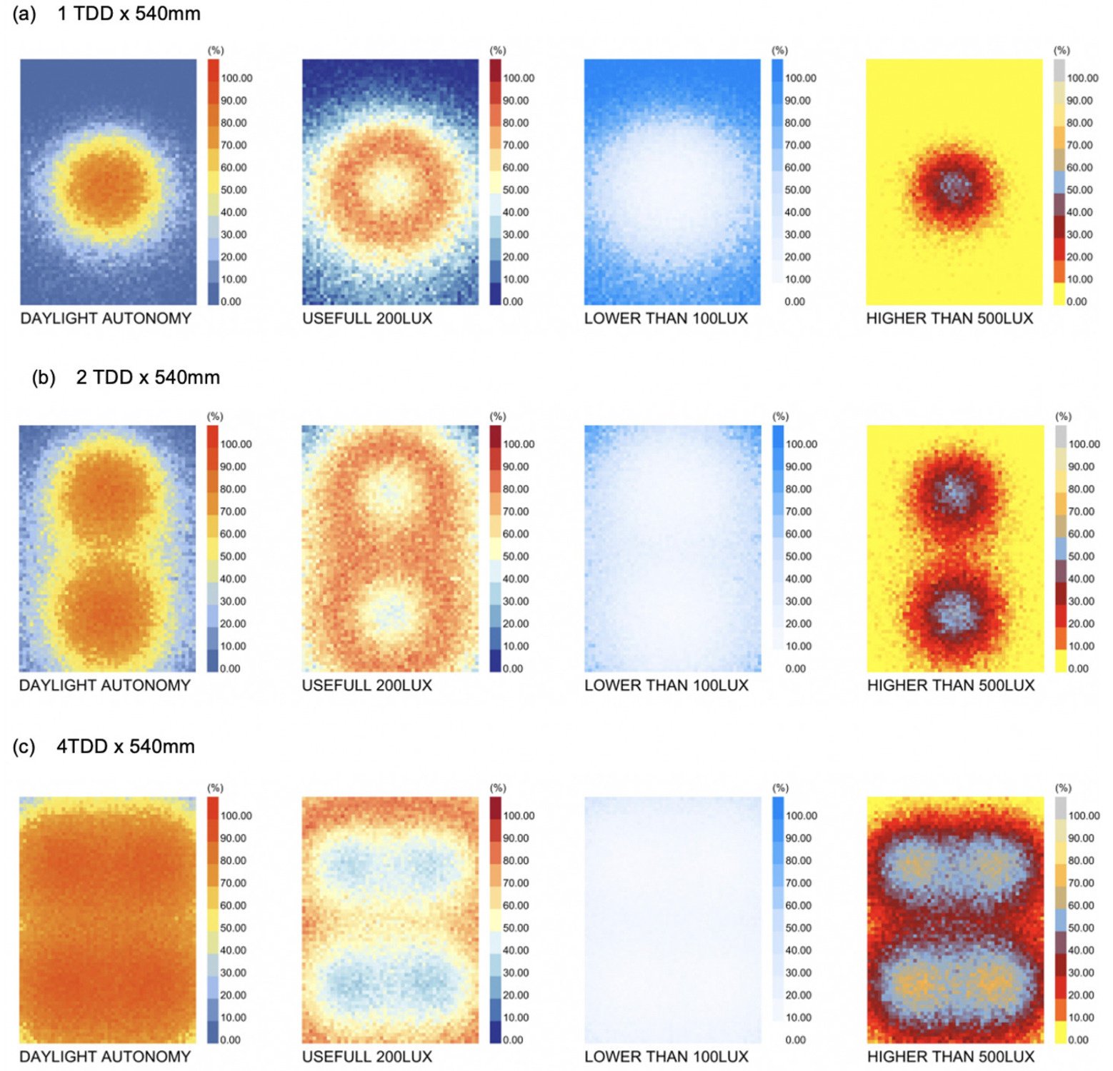 Consequently, increasing the diameter and number of TDDs improves DA but always increases the risk of over-illumination. The best compromise is the 4×350 mm configuration, which offers a satisfactory DA (38%), a high UDI-a (74%), and minimal over-illuminated zones.