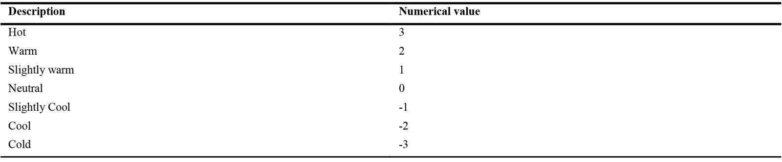 According to Fanger, who developed the influential heat balance model of thermal comfort [87] Thermal comfort occurs when skin temperature and sweating are within specific, limited ranges. Based on theoretical models of how the human body exchanges heat with its surroundings, international standards for defining comfortable indoor thermal environments have been developed [87]. Experiments conducted in climate-controlled labs or chambers have rigorously validated these models, including Fanger's Predicted Mean Vote (PMV) model. These models meet the ISO 7730 standard, which proves their accuracy and reliability. In accordance with the ASHRAE scale, the PMV model [88], a cornerstone of thermal comfort research, provides numerical values that indicate how people perceive their surroundings. As part of this calculation, six key factors are considered: metabolic rate (M), clothing insulation (Icl), air temperature (ta), mean radiant temperature (tr), water vapor pressure (pa), and air velocity (var) [89]. PMV is based on research conducted at Kansas State University and the Technical University of Denmark in the 1960s. Buildings with natural ventilation, as well as air-conditioned ones, can have PMV values. However, variations in air-conditioned buildings are usually less noticeable, as the environment in these buildings is more controlled in terms of the range of conditions that can be measured. Equations [90]. Table 2 illustrates the ASHRAE comfort scale [14], which assesses indoor thermal comfort based on temperature, humidity, air velocity, and physical activity. PMV is represented by Eqs. (4) to (10).
