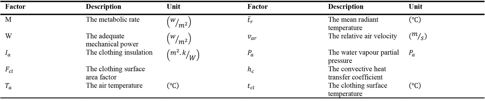 Table 3 illustrates the PMV (Predicted Mean Vote) Factors [93], which outlines the key variables influencing thermal comfort, including air temperature, radiant temperature, air velocity, humidity, clothing insulation, and metabolic rate.