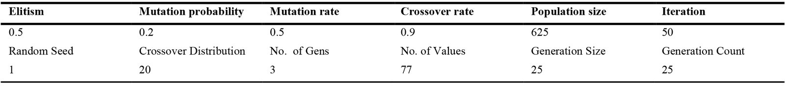 The NSGA-II algorithm's parameters are as follows: Elitism is set to 0.5, representing the proportion of the best solutions retained for the next generation. Mutation probability is 0.2, specifying the likelihood of an individual mutating to introduce variation. The mutation rate is 0.5, defining the extent to which a mutated individual changes. Crossover rate is 0.9, indicating the probability of combining two individuals to produce offspring. The population size is 625, reflecting the number of individuals in each generation. Iteration is 50, denoting the total number of evolution steps for optimization. The random seed is set to 1, enabling reproducibility. Crossover distribution is 20, designating how crossover points are distributed. Number of generations is 3, indicating cycles during parent selection and evolution. The number of values is 77, referring to the variables optimized. Generation size is 25, clarifying the number of new individuals evaluated per generation. Generation count is 25, specifying the number of groups of individuals produced and assessed during the algorithm's run.