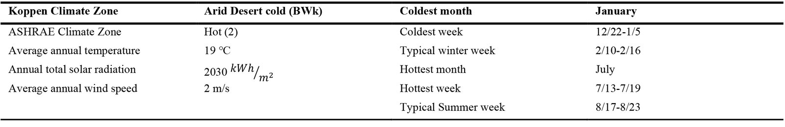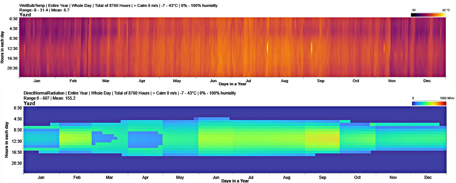 A variety of climatic systems influence Yazd throughout the year due to its location in the central part of Iran. Due to its geographic area within the global dry belt, it experiences cold winters and hot, dry summers. As with most desert regions, temperature fluctuations in Yazd are quite significant, even daily. Yazd station, for example, registers an absolute minimum temperature of -3.2°C, and an absolute maximum temperature of 41.28°C. The climate of this region is accurately depicted in Fig. 2, Which Shows the Location of Yazd, in Fig. 3, which presents Yazd's Climate Analysis by using direct normal radiation. The climate in this city is hot and arid, similar to that found in many parts of Iran. It has been reported that 98.2% of the country's area has climates like "Bwh" (35.98%), "BSk" (23.69%), "Csa" (17.03%), "BSh" (15.70%), and "BWk" (5.94%) [101]. This research aims to address daylight quality, thermal comfort, and visual comfort in hot and arid climates, which may also be helpful to others working in similar climates worldwide.